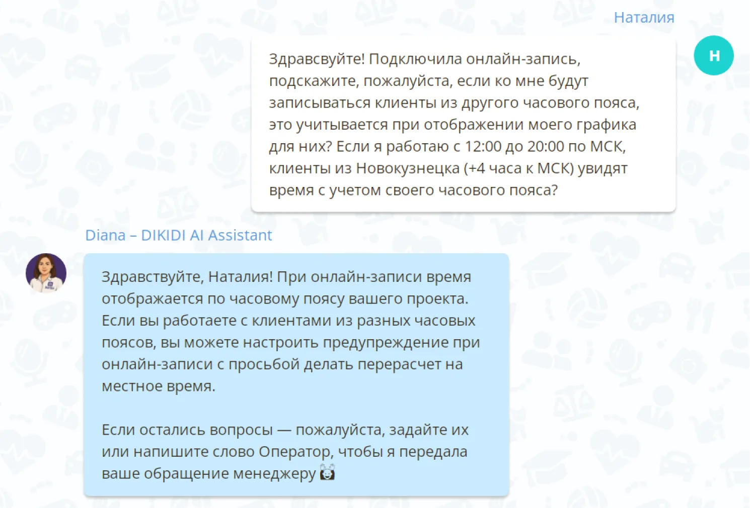 Нет автоматического учета часовых поясов. DIKIDI не пересчитывает время, когда показывает ваше расписание людям из других таймзон. Если вы в Москве, а клиент в Новокузнецке (+4 часа к Москве), он увидит ваше московское время и может ошибиться. В итоге придется каждый раз уточнять, правильно ли гости поняли время записи.