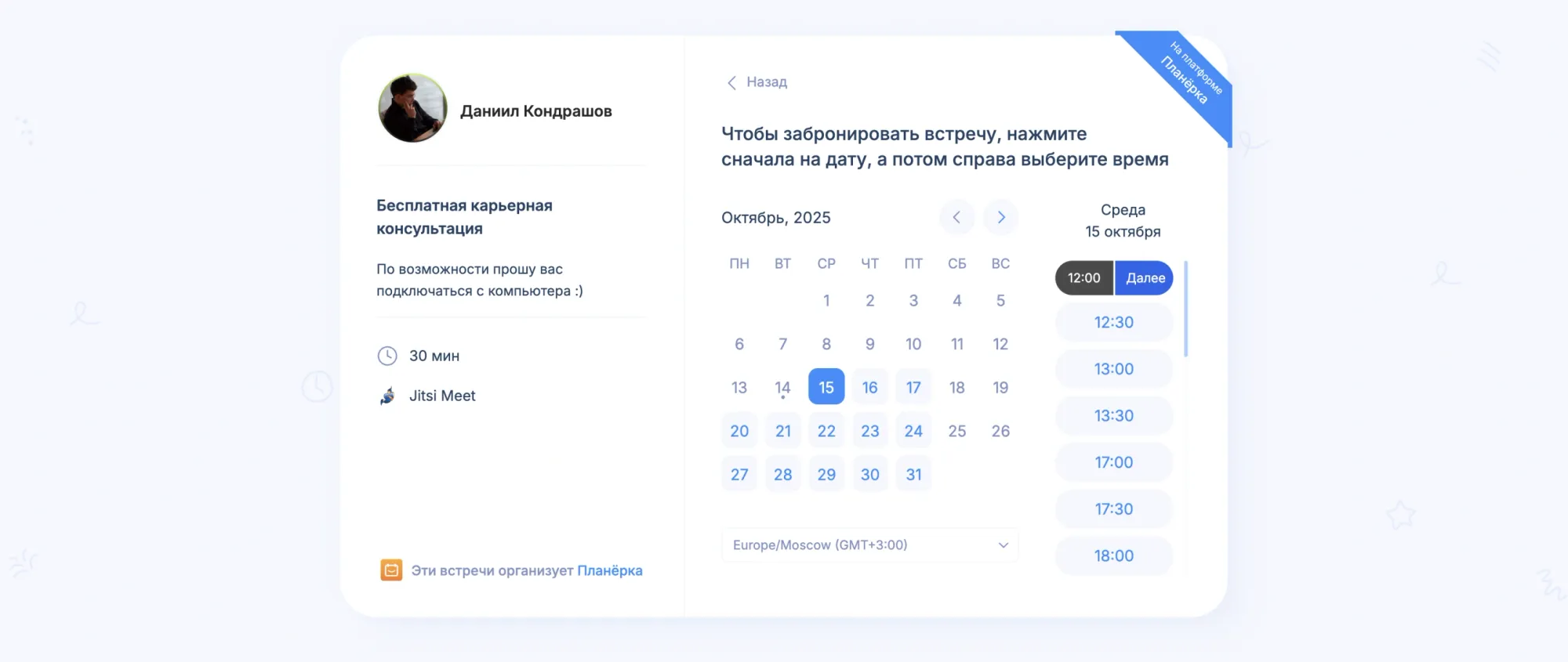 Для проведения консультаций мне нужен был подходящий сервис, который я мог бы встроить на свой сайт, чтобы посетители сразу записывались на встречу. Calendly — отпал из-за неактуальности в РФ. Российские сервисы онлайн-записи были с перегруженным интерфейсом. Я даже не регистрировался, мне не хотелось в этом разбираться.