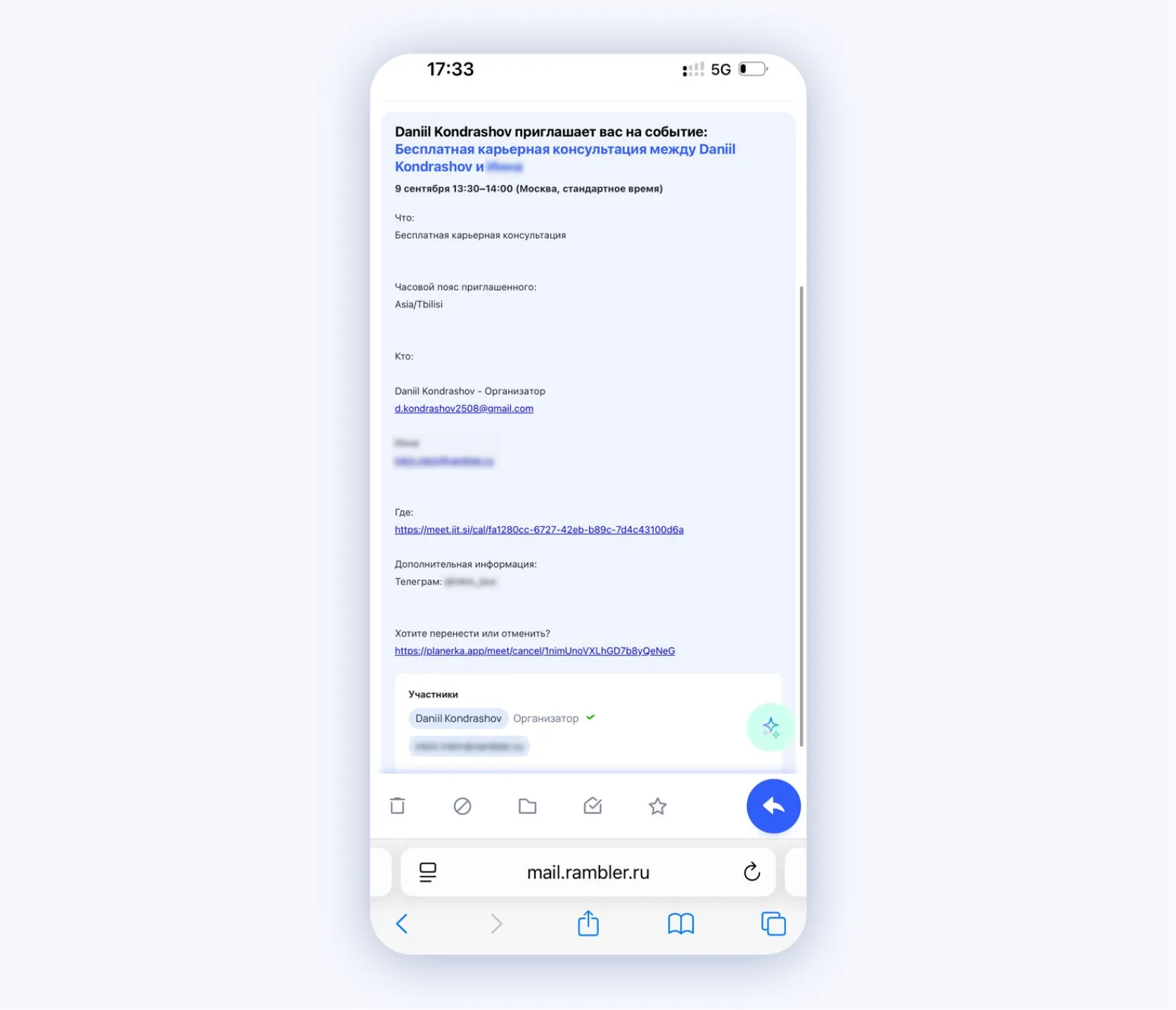- Мгновенно получает ссылку на встречу и напоминание.