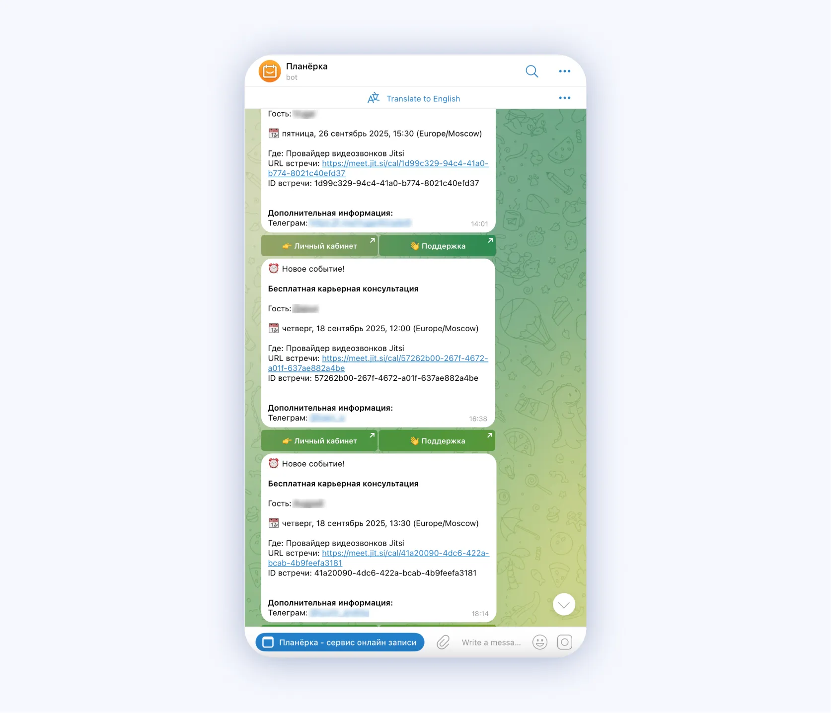 - Я получаю уведомление о встрече в Telegram.