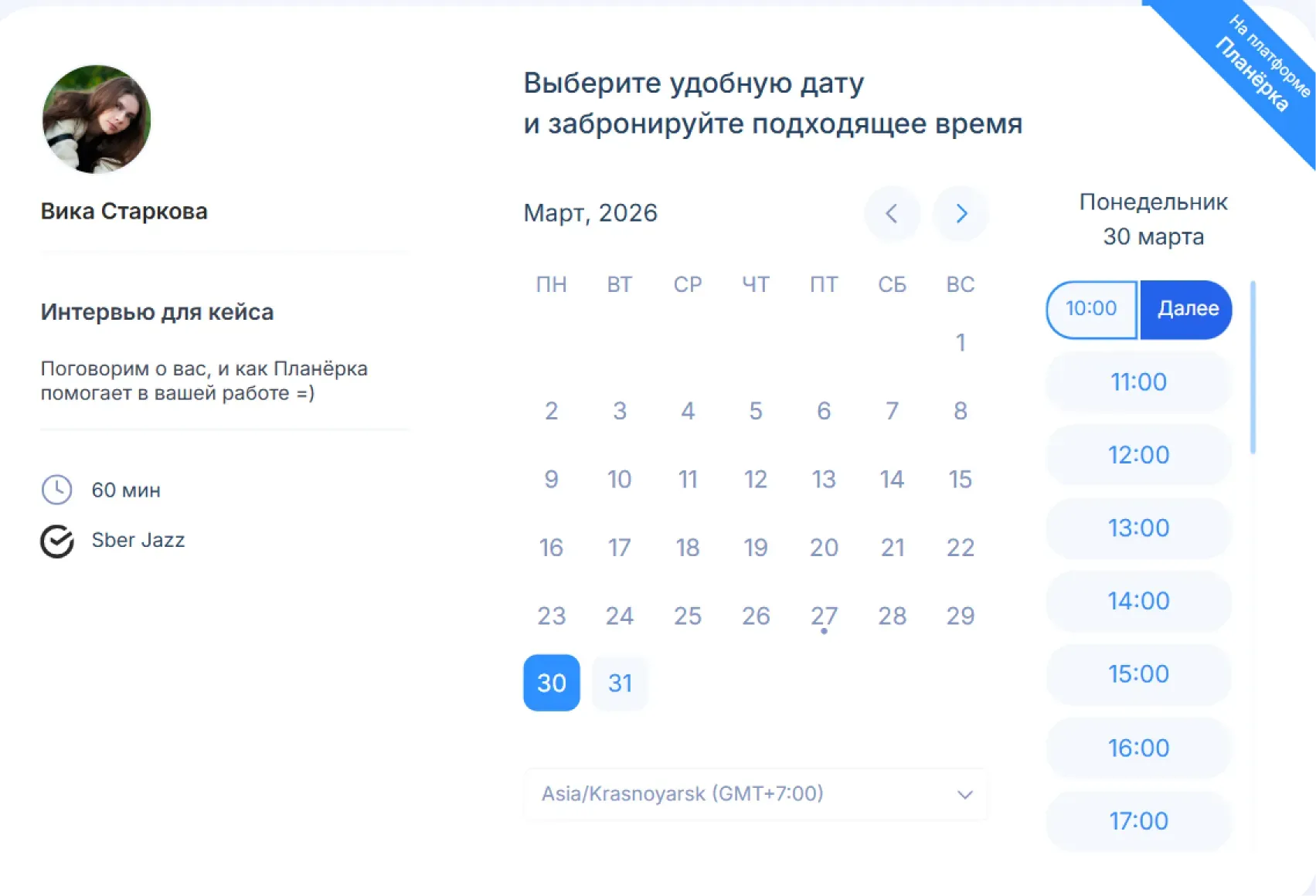 2. Собеседник переходит по ссылке и выбирает удобную дату и время созвона.