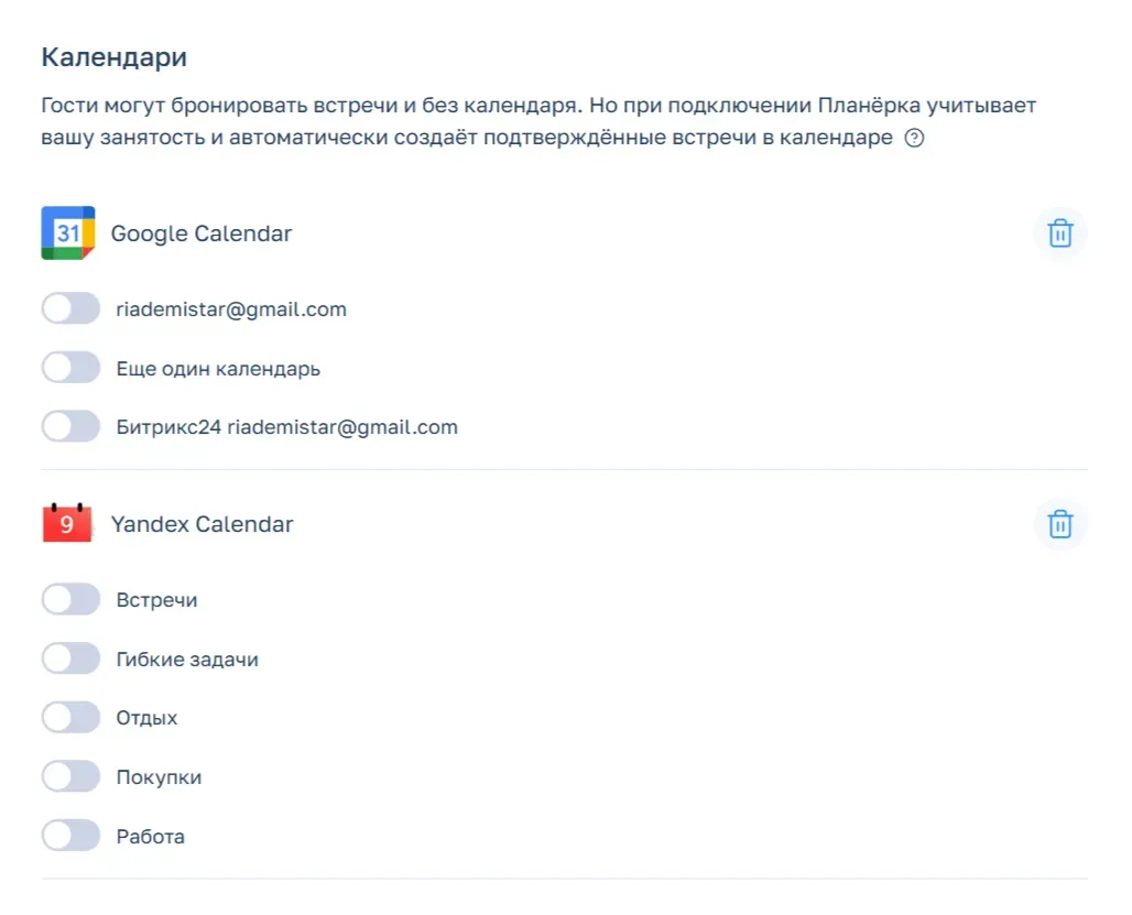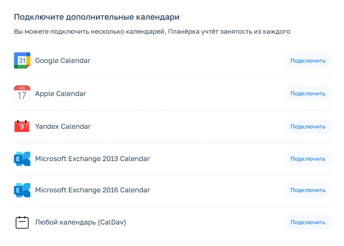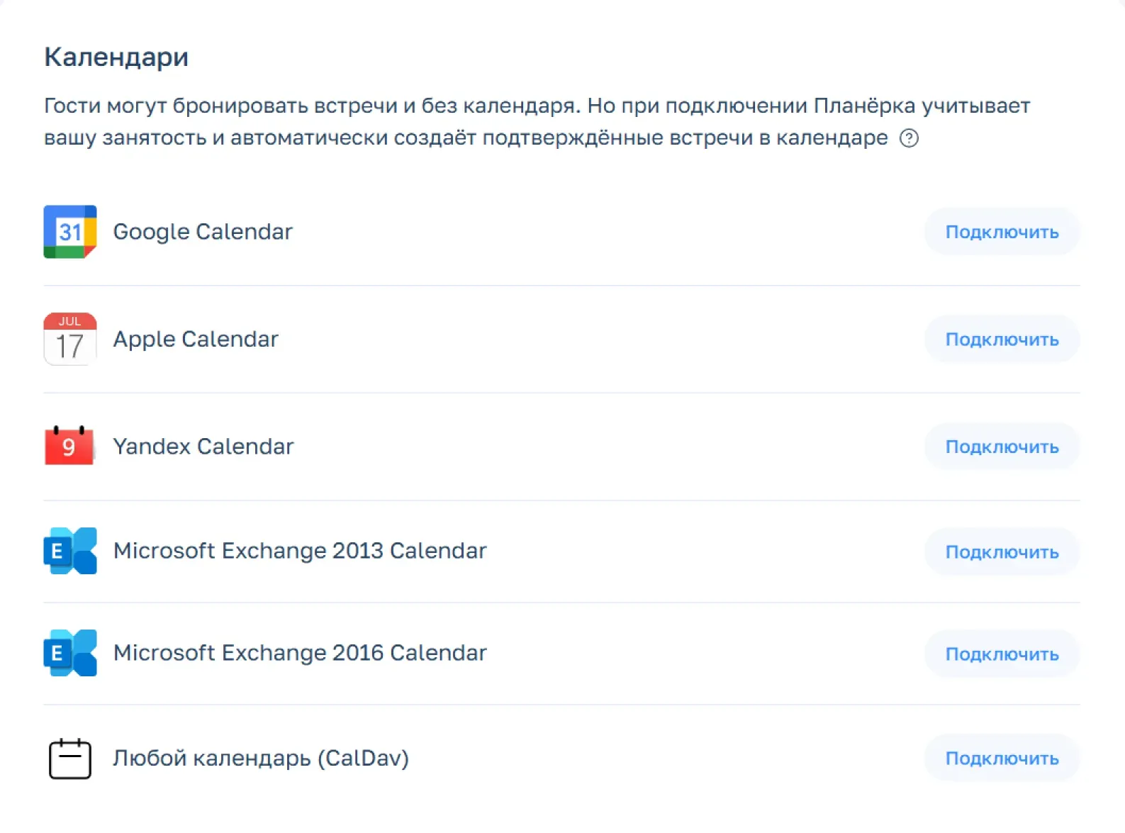 Планёрка позволяет подключить сразу несколько календарей в разделе «Интеграции» и синхронизировать расписание между ними. Назначенные встречи отобразятся сразу во всех подключенных календарях.