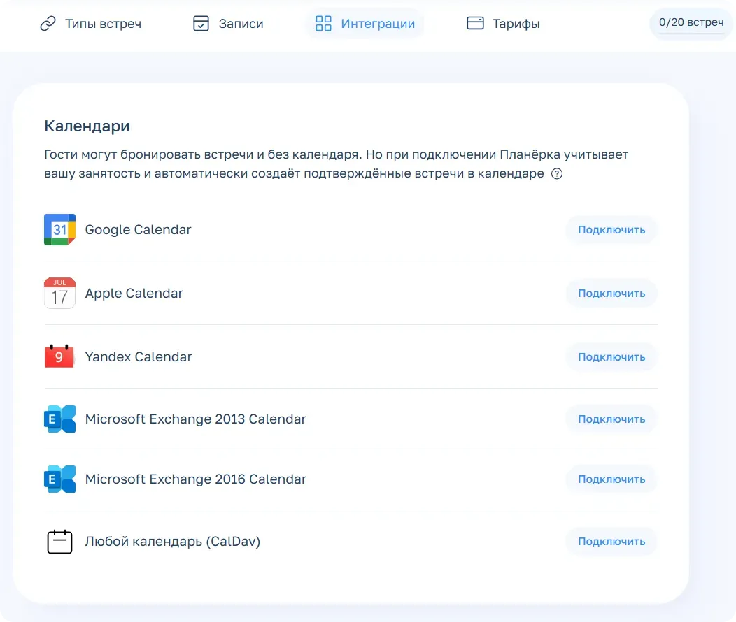 Большинство сервисов предлагают бесплатный тариф с базовыми функциями. Например, в Планёрке бесплатный план включает до 20 встреч в месяц и синхронизацию с календарём, видеосервисом, телеграм и оплатой. Платные тарифы начинаются от 1 000 ₽ в месяц. Подробное сравнение — в обзоре бесплатных сервисов записи.
