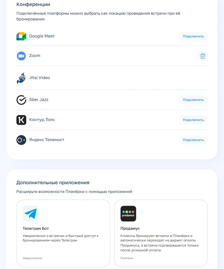 Онлайн-календарь, видеосервис и телеграм-бот вы можете подключить в разделе «Интеграции»