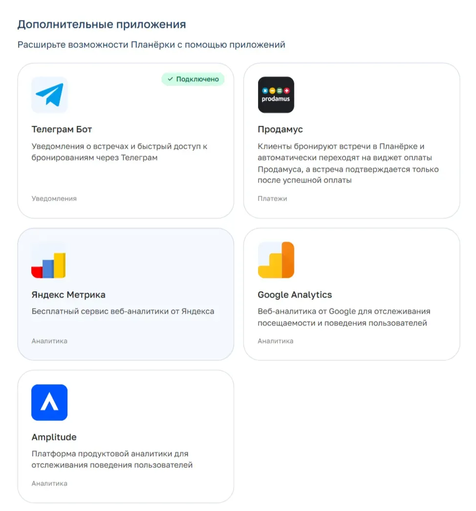 Шаг 2. В личном кабинете Планёрки перейдите в раздел «Интеграции», там вы подключите: