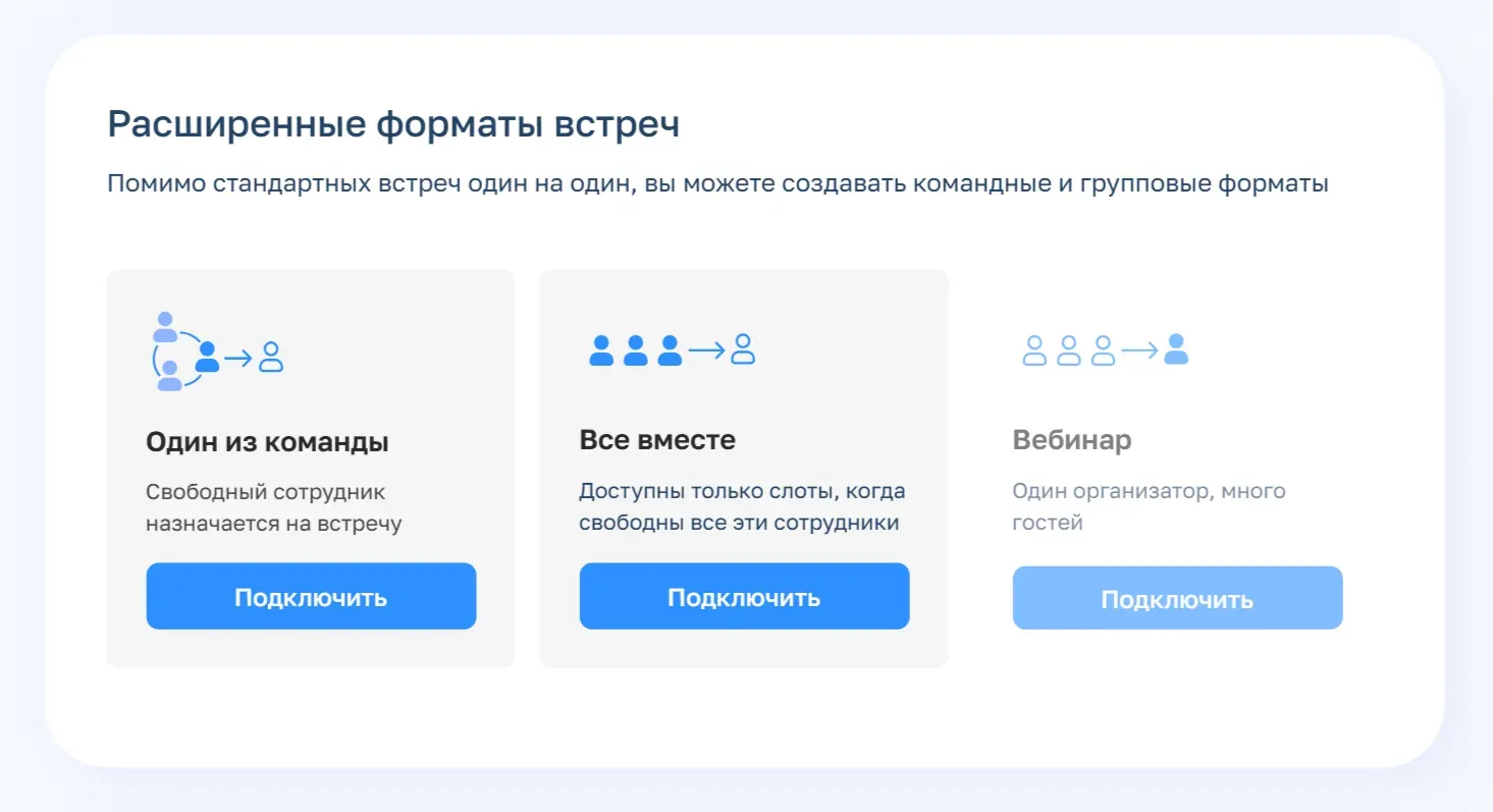 - Для командной работы есть форматы, которые распределяют встречи на свободных сотрудников или ищут слот, когда доступны все