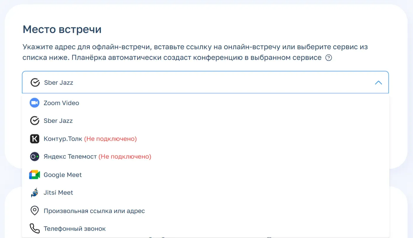 - В блоке «Место встречи» достаточно указать видеосервис для автоматической генерации ссылок (Zoom, SberJazz и др.), либо постоянную ссылку на онлайн-комнату, номер телефона или адрес офиса
