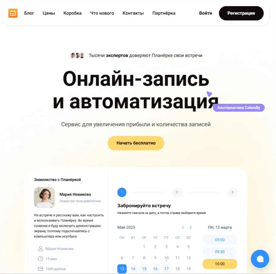 Российский сервис для онлайн-записи Планёрка синхронизируется с Google Календарем и позволяет бесплатно создавать любое количество расписаний встреч с разной длительностью и условиями. Система автоматически учитывает ваши события в календаре, скрывая занятые часы для записи, а каждое новое бронирование заносит в ваш список задач. Кроме того, Планёрка определяет часовые пояса организатора и участников встречи.