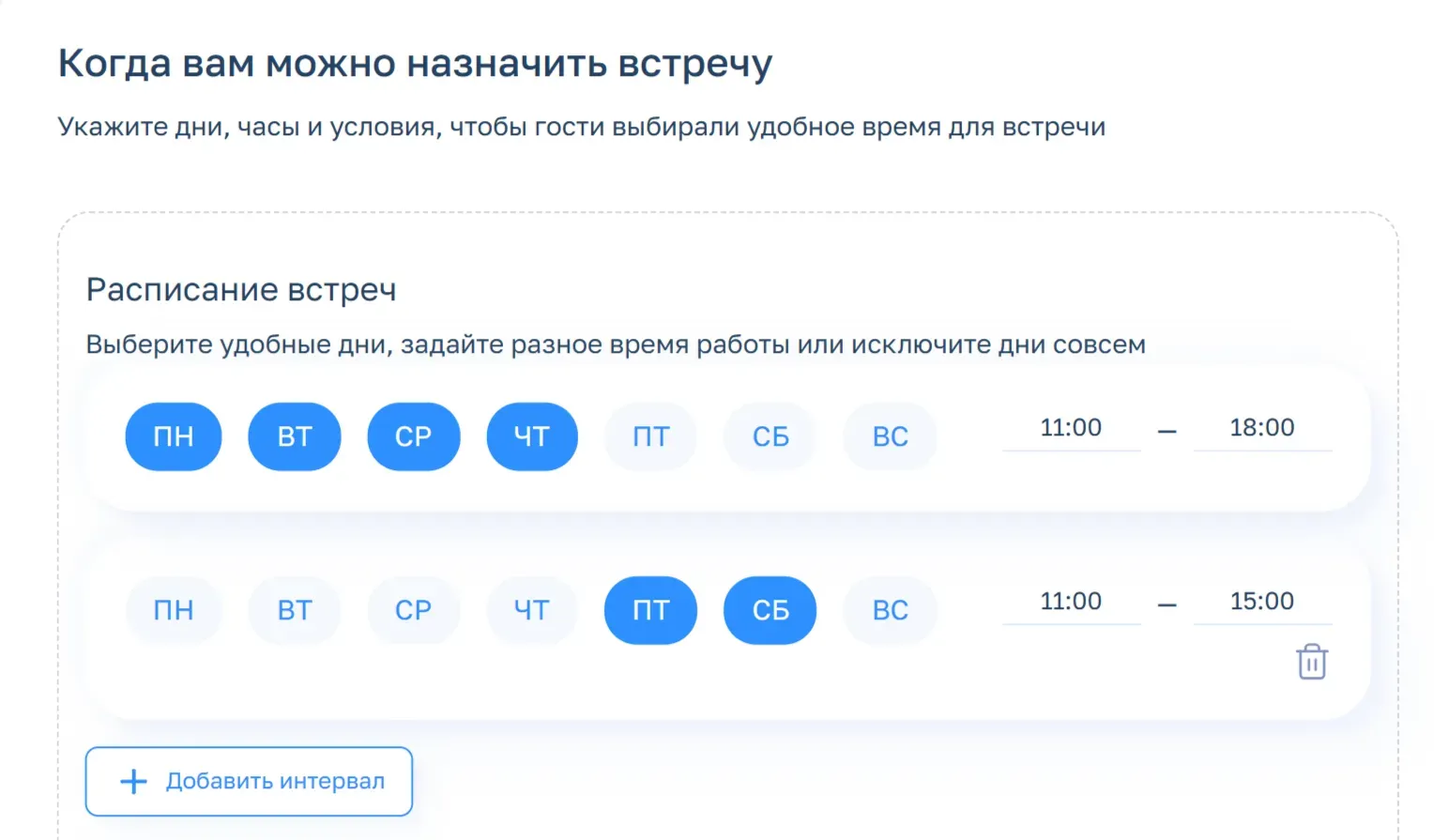 - В настройке расписания легко задать определенные часы для каждого дня недели. Например, с понедельника по среду принимать гостей с 11:00 до 18:00, а в четверг — только до 15:00