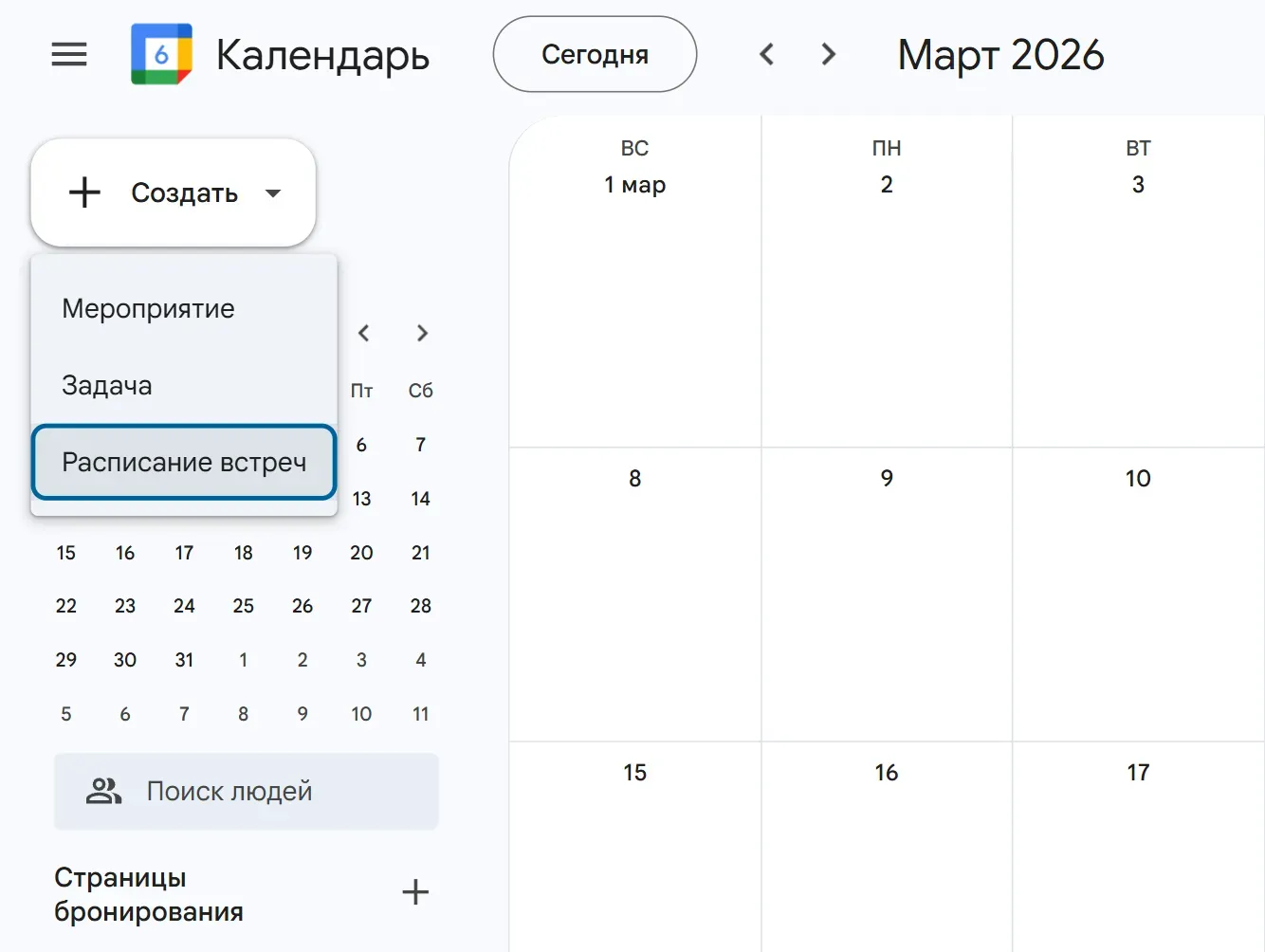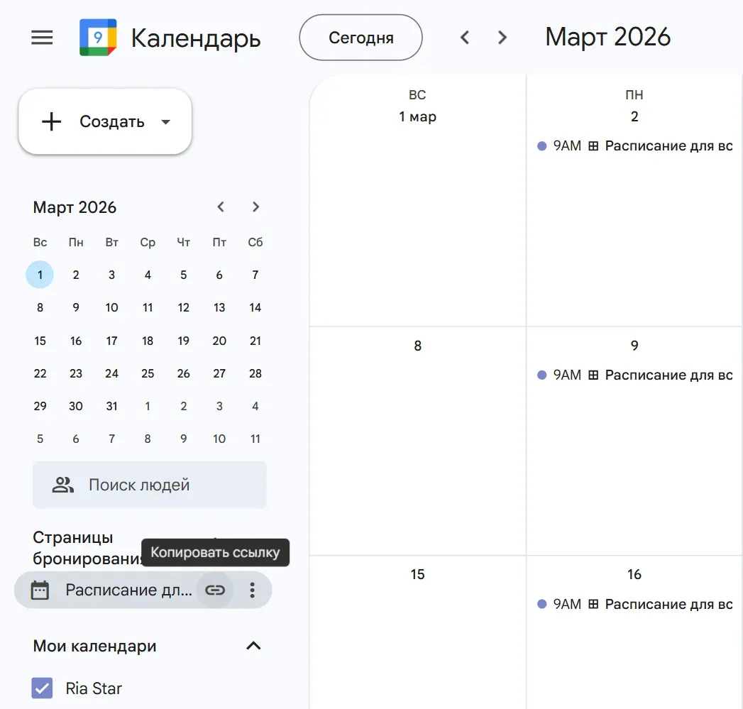Чтобы назначить встречу через Google Календарь, в левом боковом меню ниже «Страницы бронирования» нажмите на значок ссылки возле своего расписание. Скопируйте эту ссылку и отправьте ее собеседнику.
