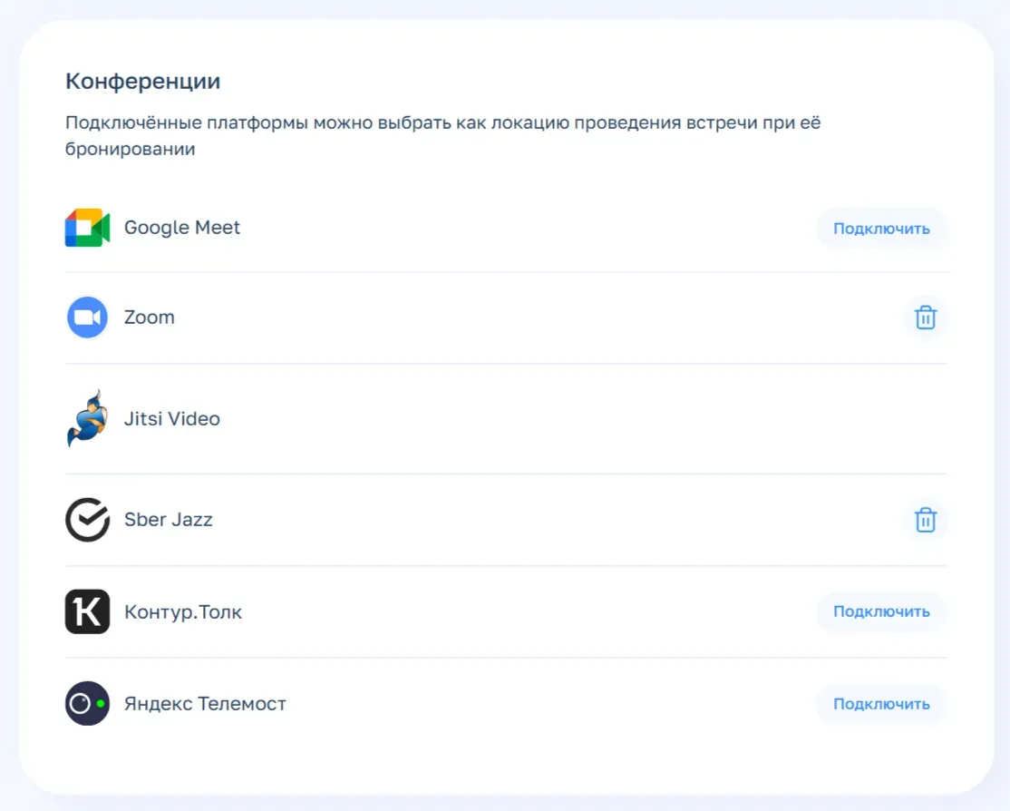 - Видеосервис. Например, чтобы добавить Zoom, достаточно нажать «Подключить» и войти в свой аккаунт, также можно авторизоваться через Google