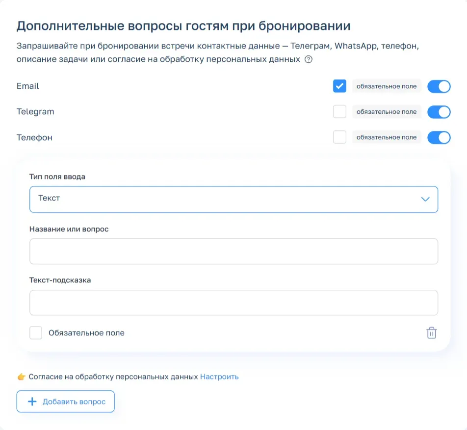 - В блоке «Дополнительные вопросы гостям при бронировании» можно добавить несколько полей для обязательного заполнения: номер телефона, ник в Телеграме и даже согласие на обработку персональных данных