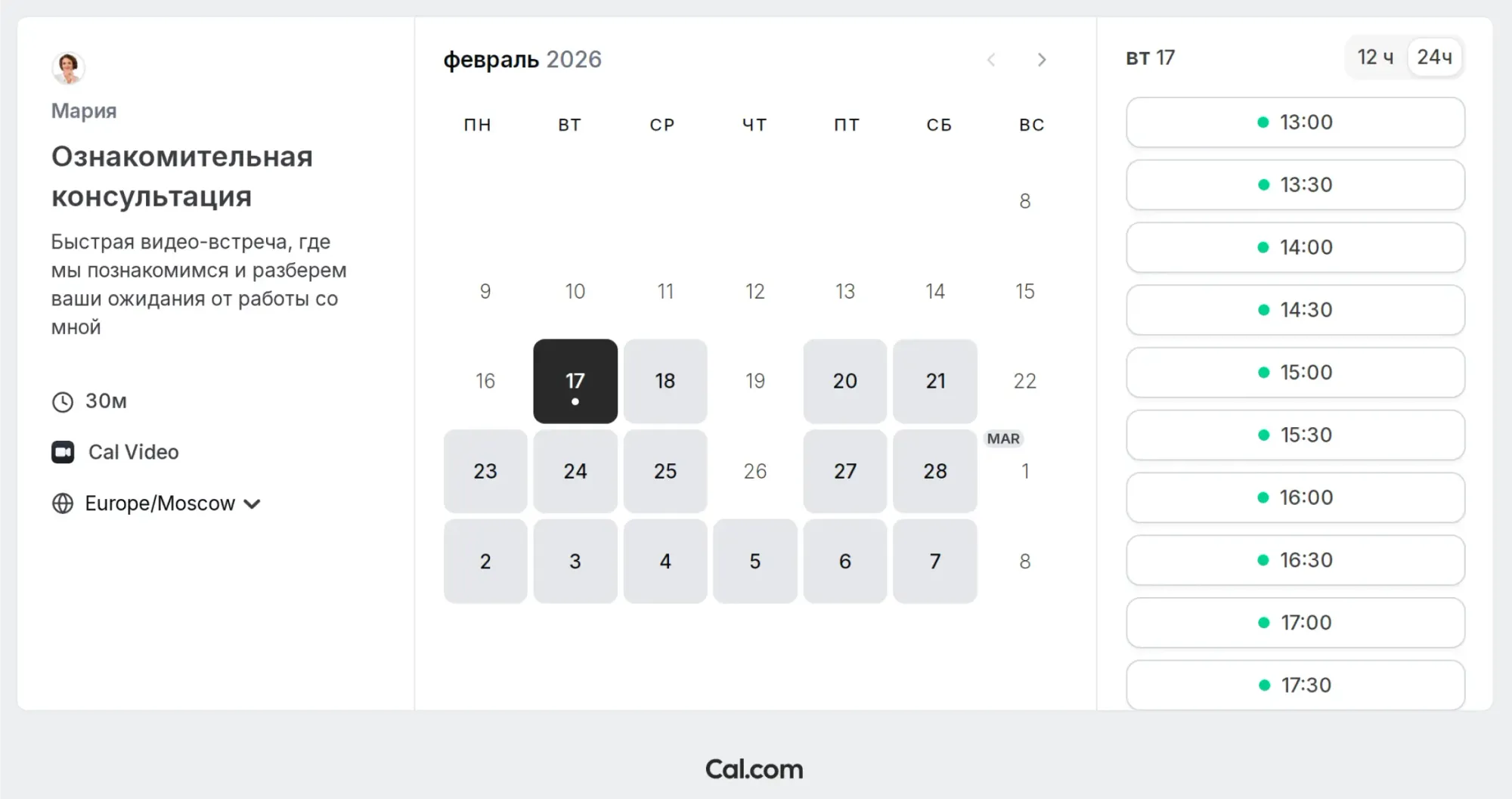 Cal.com — мощный конструктор для тех, кто работает с зарубежным рынком. Сервис вам подойдет, если вы вы работаете с иностранными клиентами, и вас не смутит сложная настройка расписания, техподдержка на английском языке, оплата зарубежной картой.