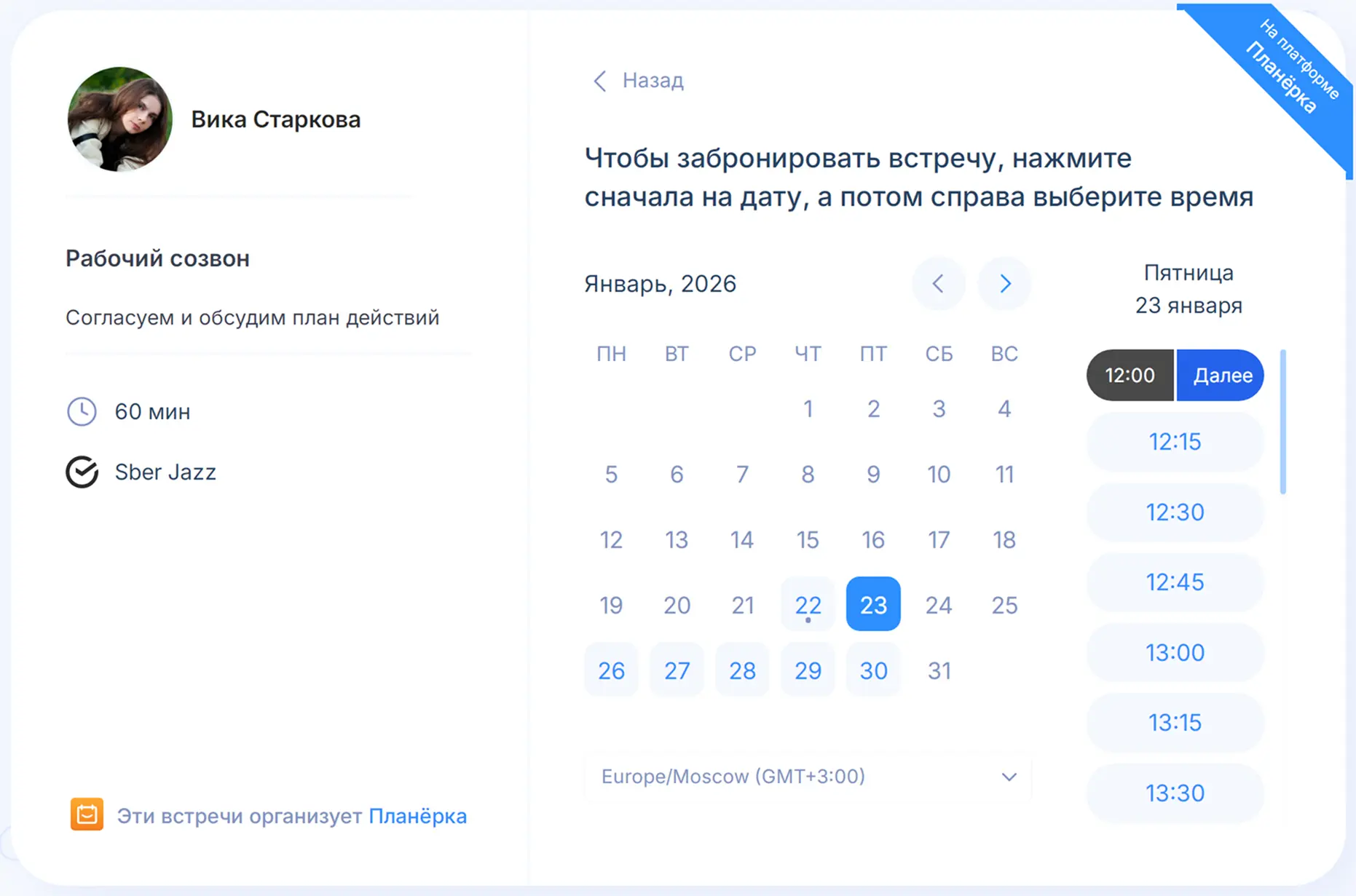 С Планёркой и Cal.com можно забыть, каково это — открывать видеосервис, создавать конференцию и пересылать приглашение. Когда гость забронирует время, ссылка на встречу создастся автоматически и придет в напоминании о записи.