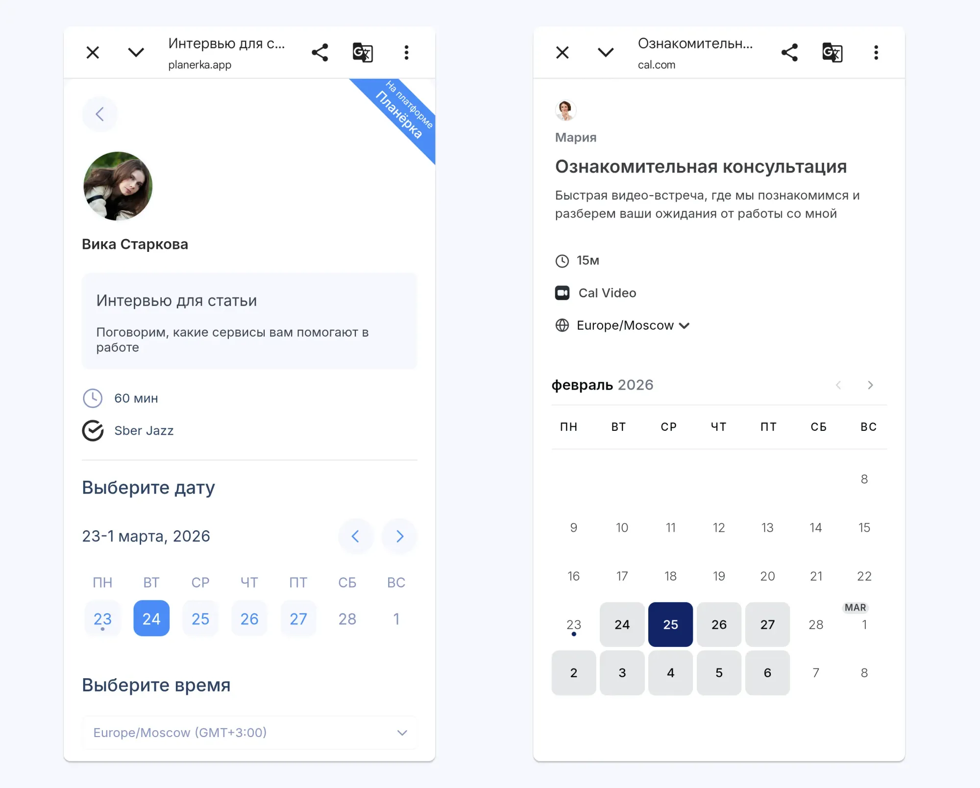 Слева — публичная страница в Планёрке, справа — в Cal.com