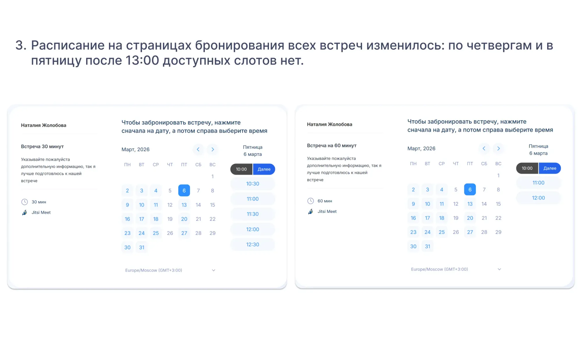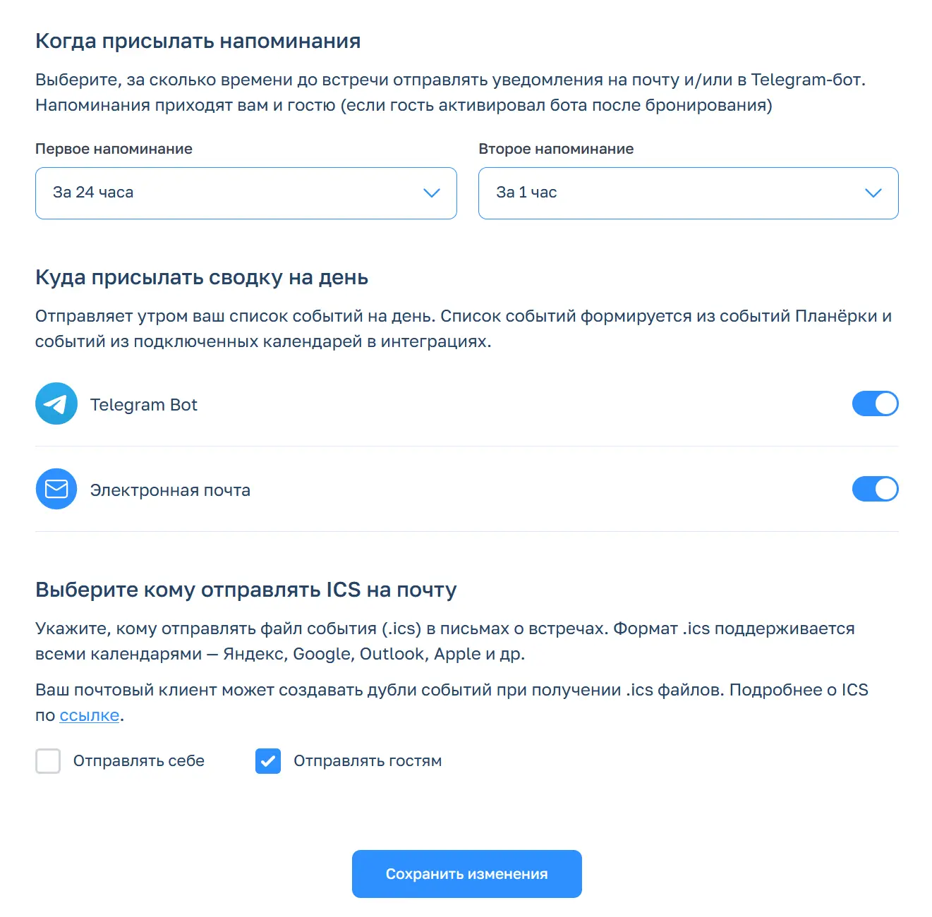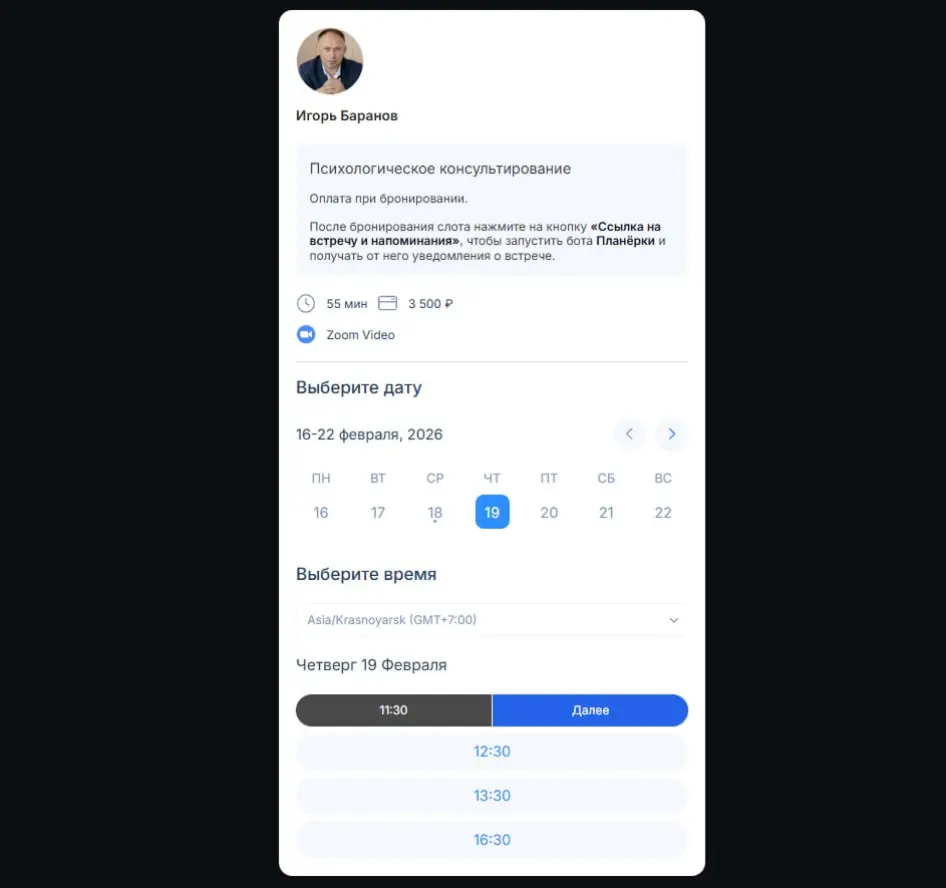 Синхронизация с календарями позволяет автоматически учитывать личную занятость при планировании встреч — если вы внесли в расписание тренировку или поход к врачу, система все видит и делает это время недоступным для записи.