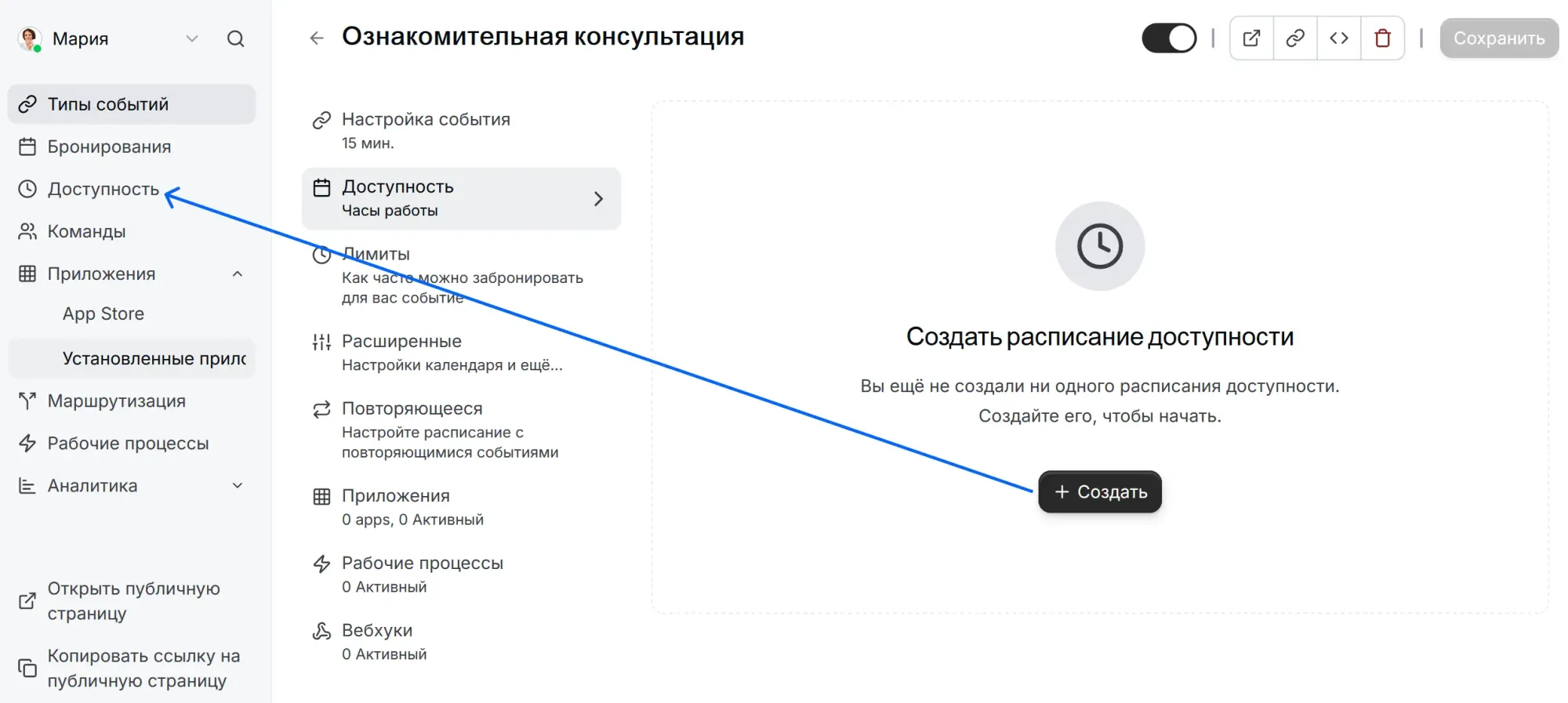И вот тут важно: при создании встречи нельзя просто выбрать дни и часы. Система требует привязать уже готовое «расписание доступности». Если вы еще не создавали ни одного — по кнопке «Создать» вас перекинет в другой раздел.
