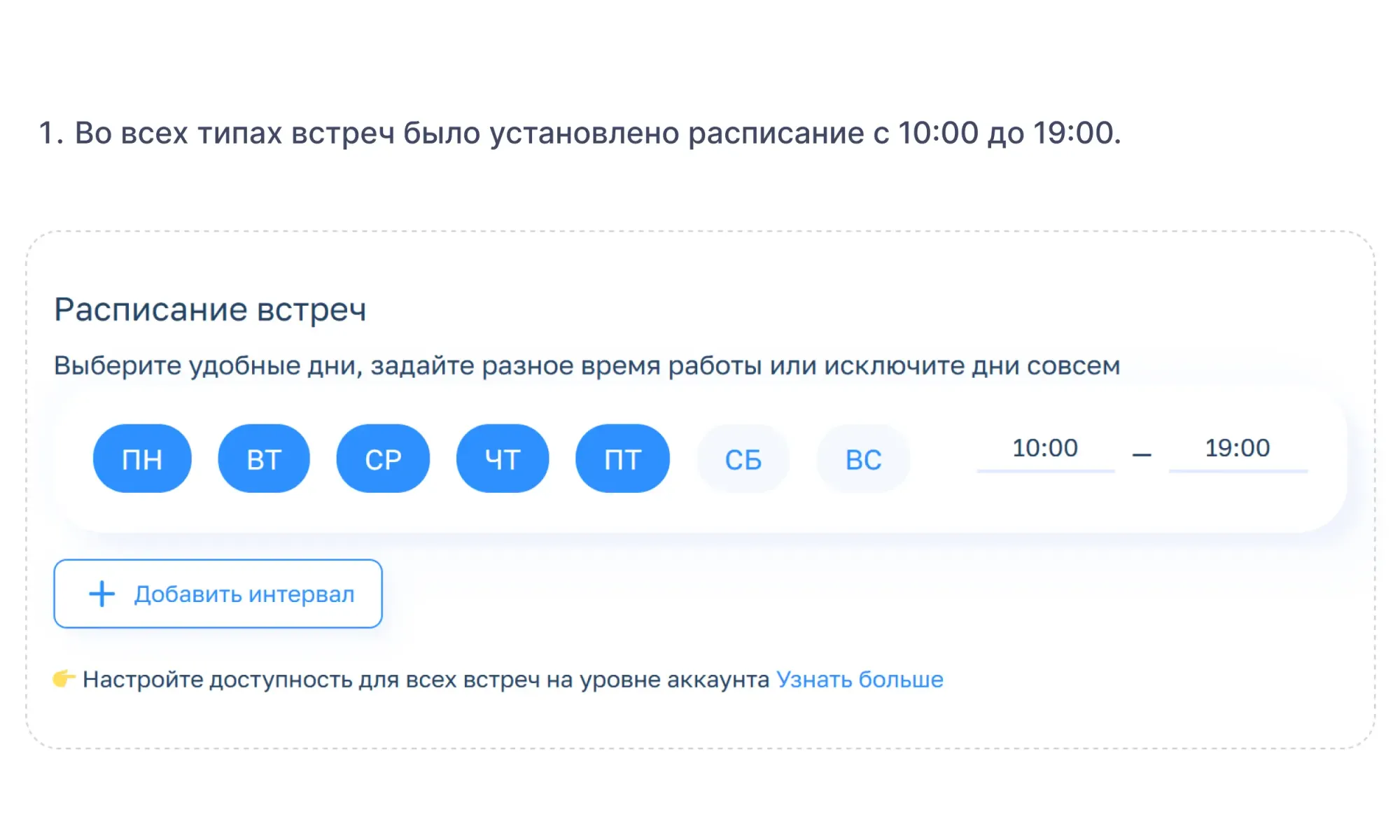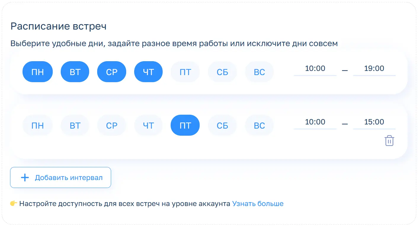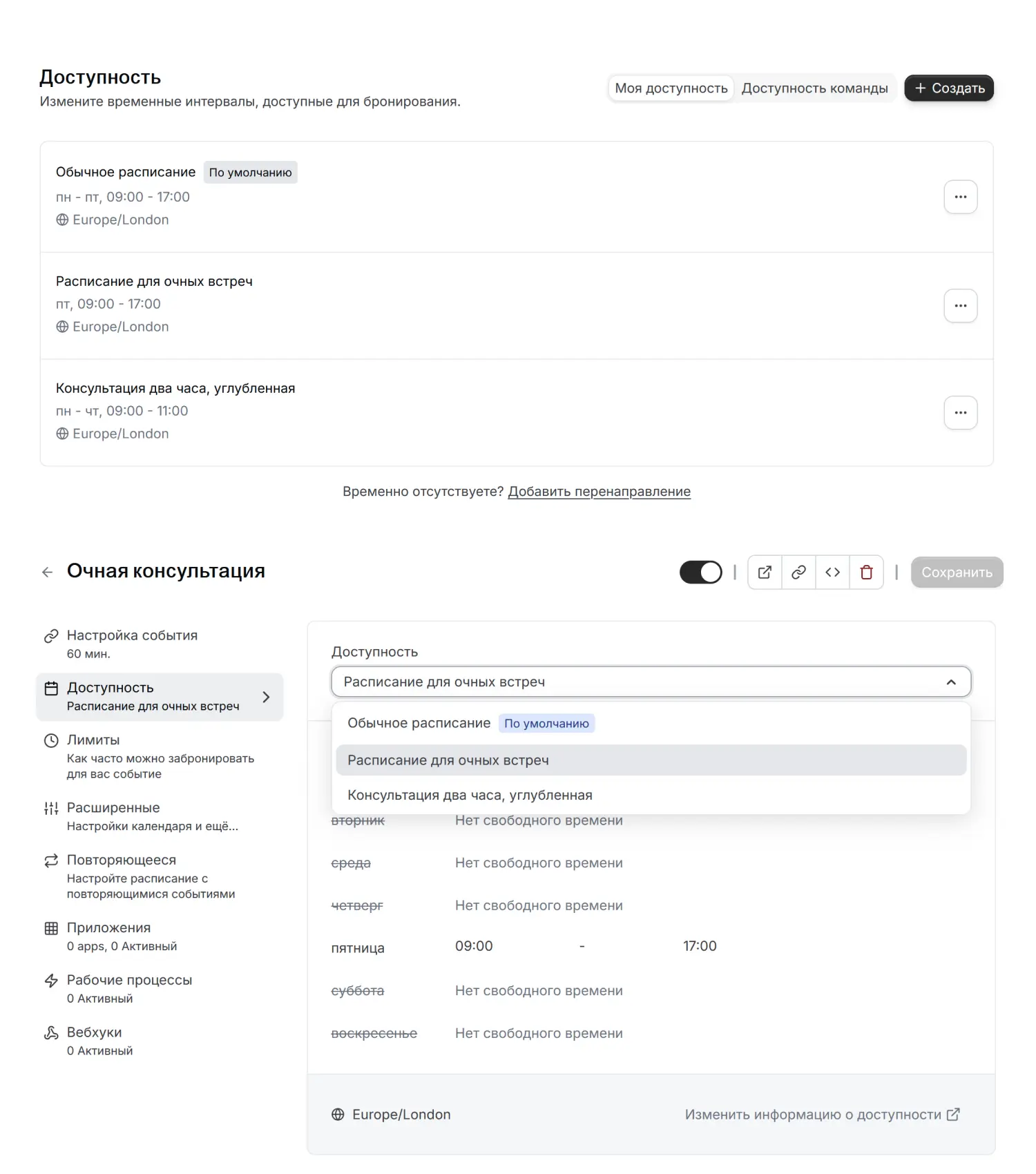 Например, у вас настроено 5 типов консультаций — 15-минутное знакомство, консультация по предоплате и т .д. У каждой расписание с 10:00 до 21:00. Но в следующем месяце вы проходите обучение и сможете принимать клиентов только с 10:00 до 17:00. Вместо того чтобы лезть в настройки каждой встречи, просто меняете «Глобальную доступность» — система скроет все вечерние слоты. Вы не забудете поменять расписание у какой-то одной консультации и не получите запись на занятое учебой время.