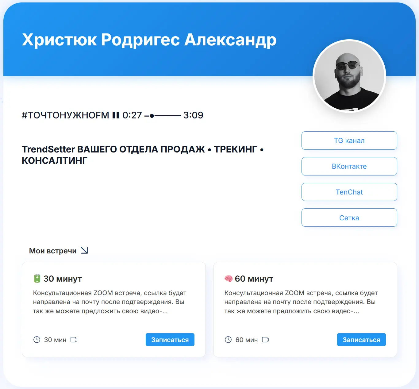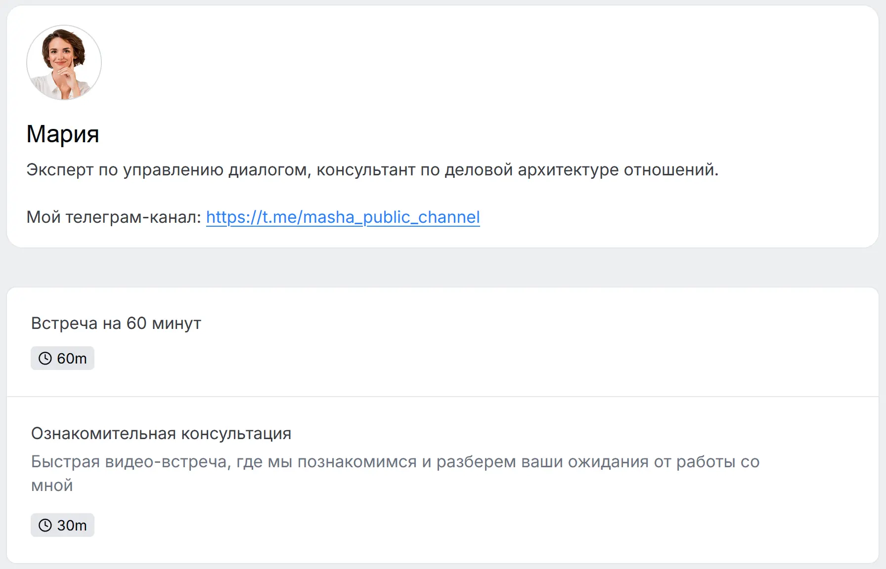 Планёрка и Cal.com создают для пользователя публичную страницу-визитку сразу после регистрации. На этой странице пользователь может загрузить фото, рассказать о себе и своих услугах, выбрать, какие консультации будут отображаться, а какие нужно скрыть (например, собеседование). Ссылку на публичную страницу можно разместить в описании профиля, в подписи, в email-рассылках, где угодно. Клиенты переходят по ссылке, видят информацию, отзывы о специалисте, встречи и записываются.
