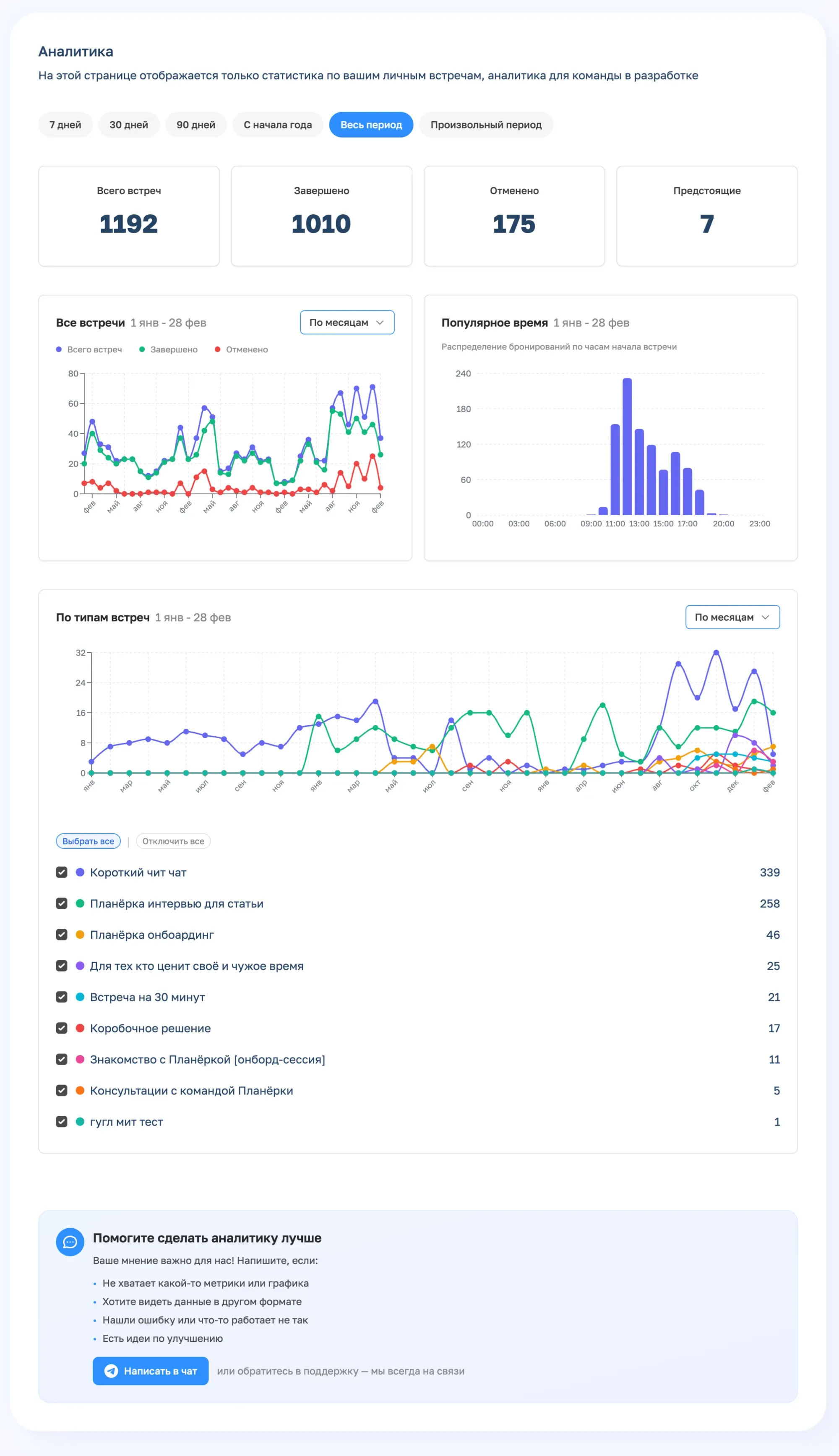 Чтобы больше зарабатывать, нужно периодически заглядывать в аналитику и смотреть, откуда клиенты приходят, какие встречи выбирают и в какое время чаще записываются. Так вы будете развивать именно то, что действительно приносит прибыль, и сможете вовремя выявить проблемы в проекте и решить их (например, улучшить описание платной встречи).