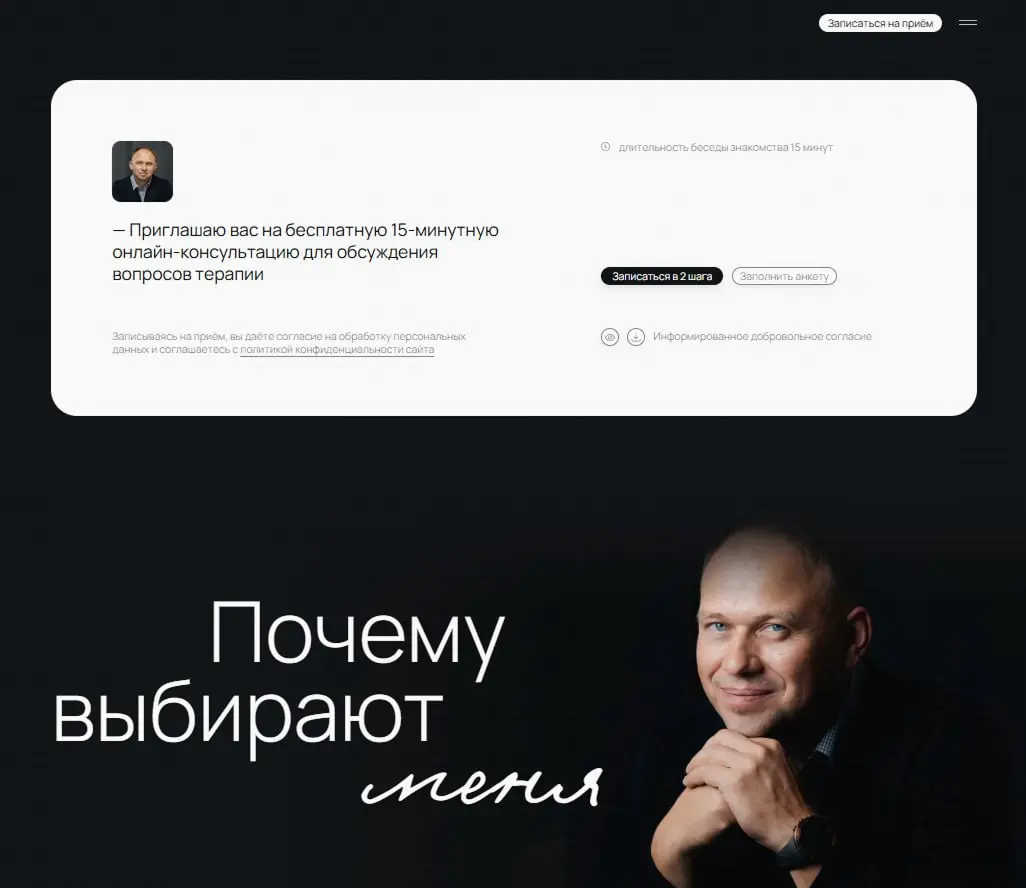 Виджет онлайн-записи встраивается в страницу и позволяет забронировать время сразу на сайте — клиенту не нужно переходить по внешним ссылкам. Это выглядит профессионально, вызывает доверие и не дает людям «потеряться» на пути к записи.