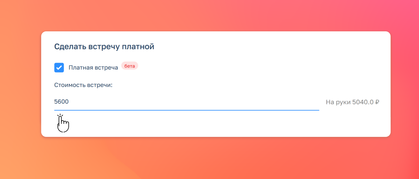 - Укажите стоимость встречи. Обратите внимание: Планёрка удерживает комиссию 10%, которая уже включает все расходы на обработку платежа Т-Банком и работу платформы.