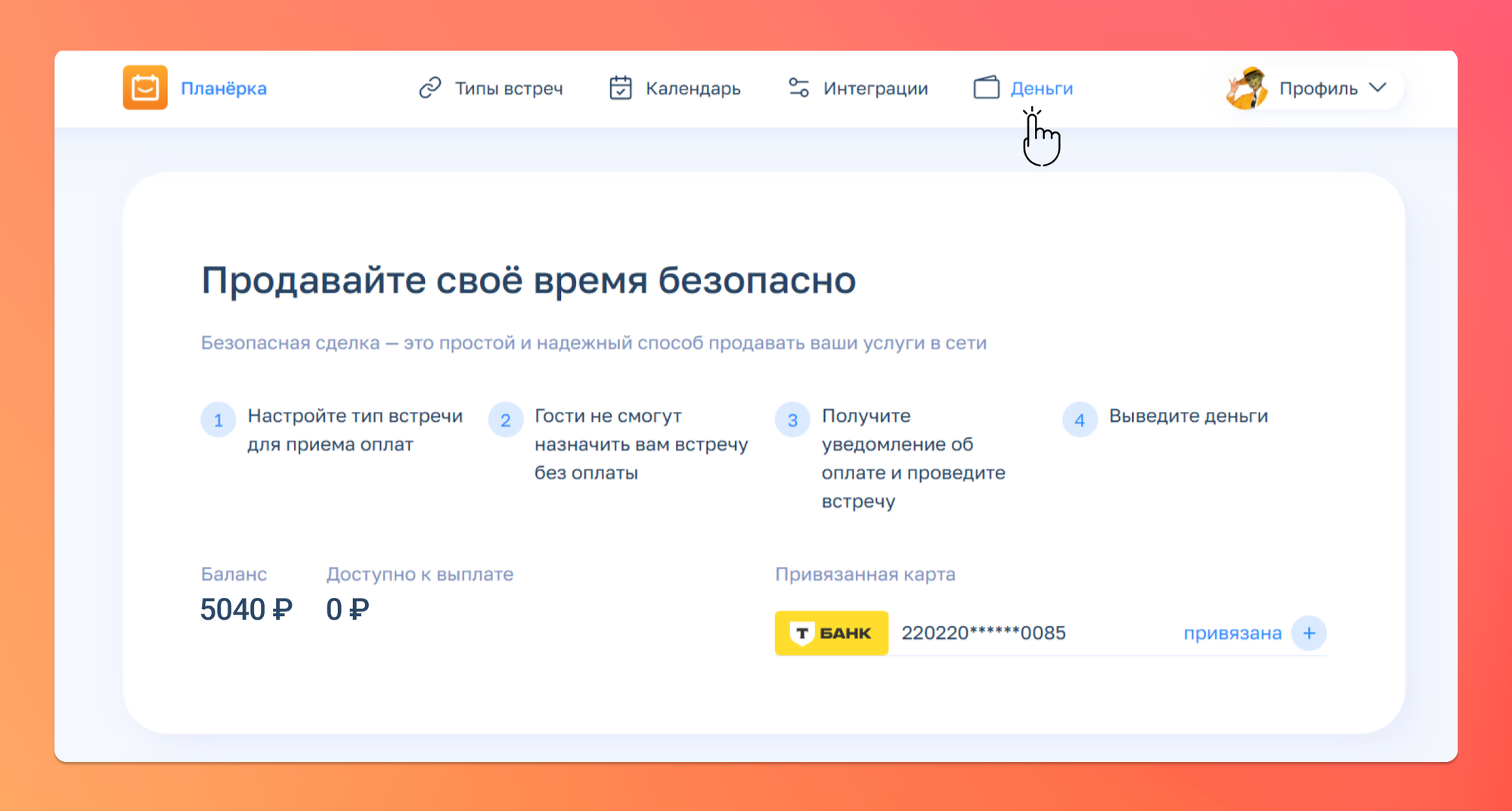 В Планёрке легко организовать платную встречу. Создайте консультацию, установите цену — и клиенты оплатят напрямую. За все финансовые операции отвечает Т-Банк. Деньги поступают на ваш баланс в личном кабинете, а вы можете вывести их на карту.
