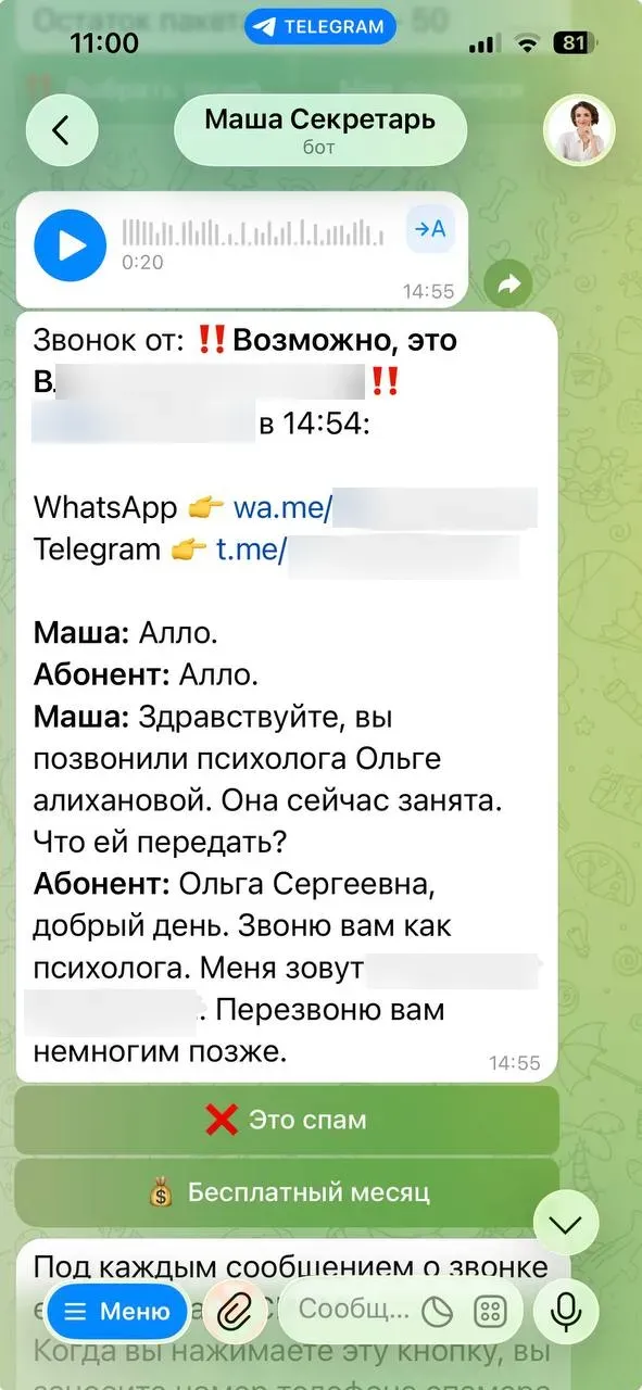 Машу я подключила. Самое главное, что она отсекает спам, принимает звонки и присылает расшифровку.