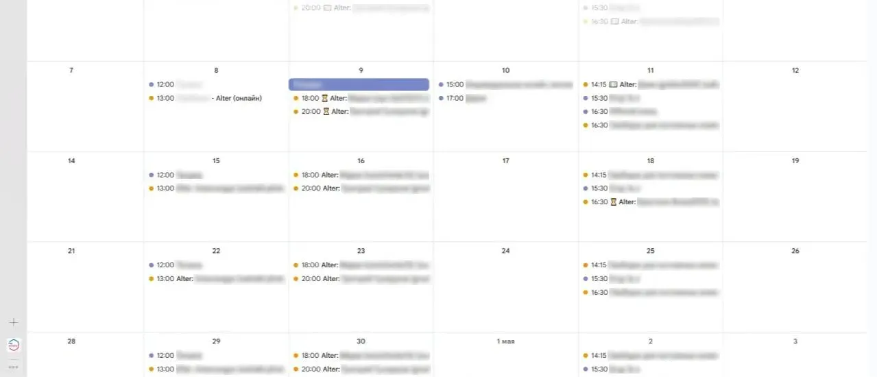 Если кто-то записался через Alter или я внесла в календарь личные дела, Планёрка закрывает эти окна для записи. В итоге я принимаю клиентов из агрегатора и личных рекомендаций от коллег и врачей, не боюсь, что на один слот случайно запишутся двое.