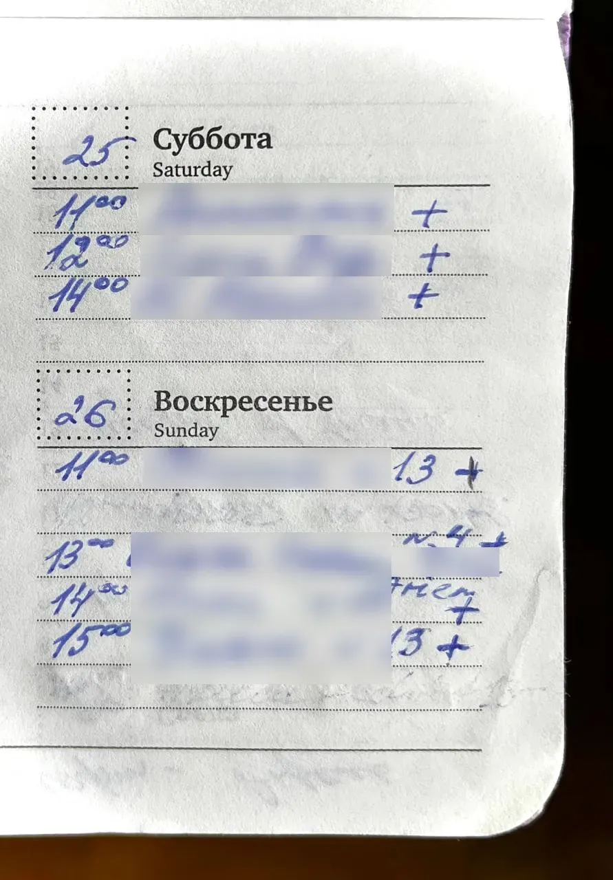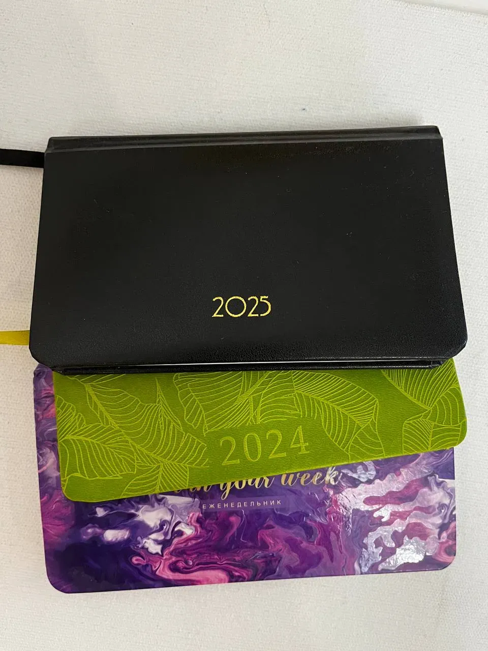 Каждый год я покупала новый ежедневник, у меня уже их целая коллекция. Справа — пример, как я записываю встречи и свободные слоты