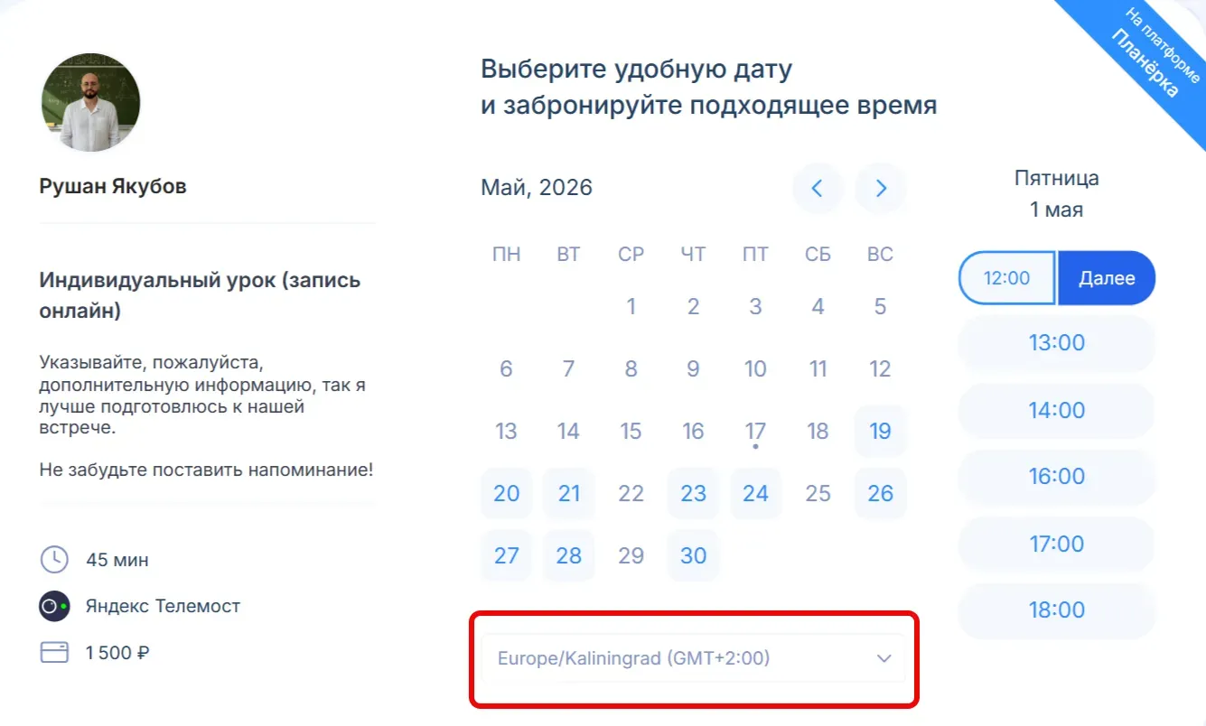 При этом сервис записи для репетитора решает главную проблему независимой практики — организацию процесса. Ученик заходит на вашу страницу, видит доступные слоты, записывается, получает напоминание. Вы не тратите время на то, что раньше делала площадка.