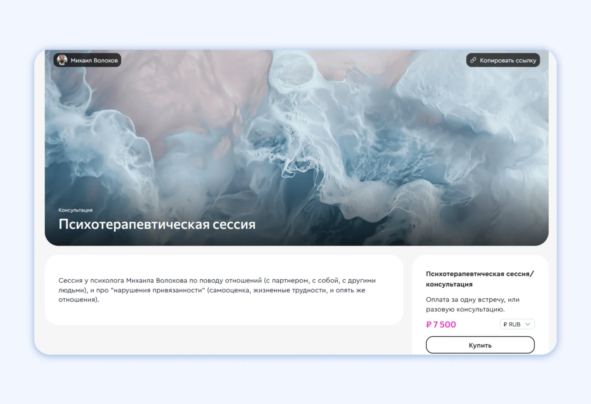 Я запускаю рекламу в социальных сетях с приглашением на бесплатную диагностическую встречу. На этой встрече знакомлюсь с потенциальным клиентом, обсуждаю тему его запроса и говорю, чем могу помочь. Если человек чувствует себя комфортно и готов продолжить работу, он записывается на платные сессии. Тогда я отправляю ему две ссылки:
