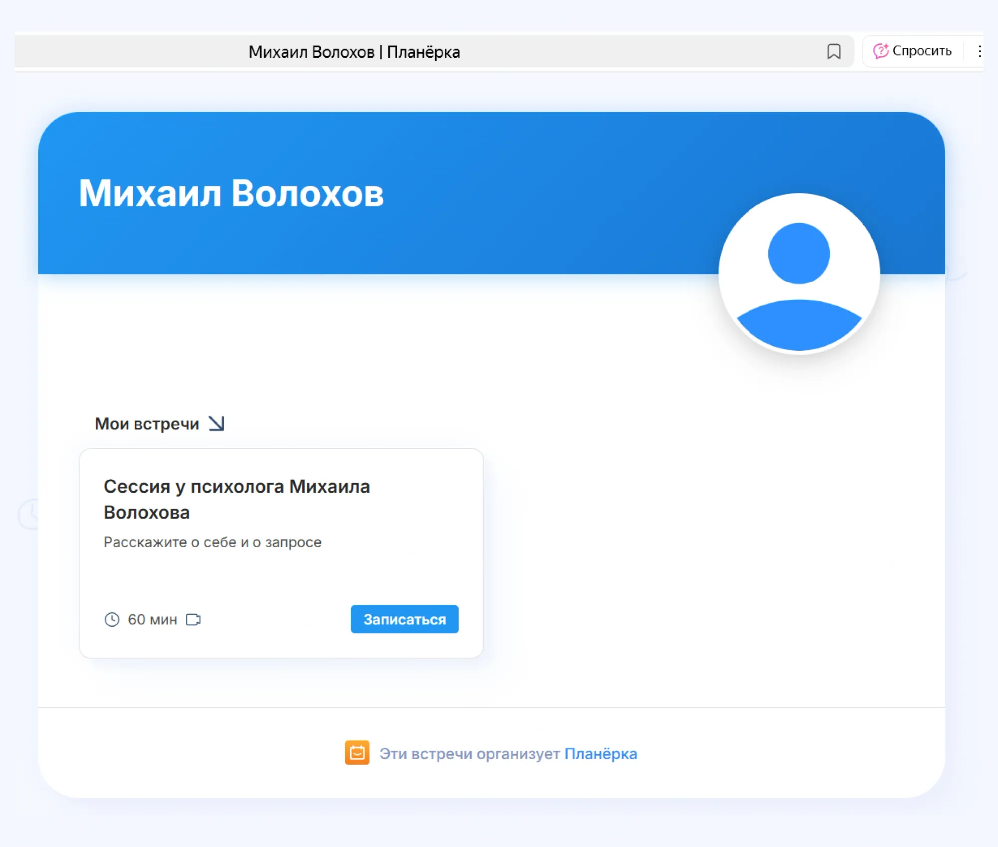 После настройки я отправил клиенту ссылку на встречу. Он перешел на мое расписание в Планёрке и выбрал удобное время с учетом своего часового пояса.